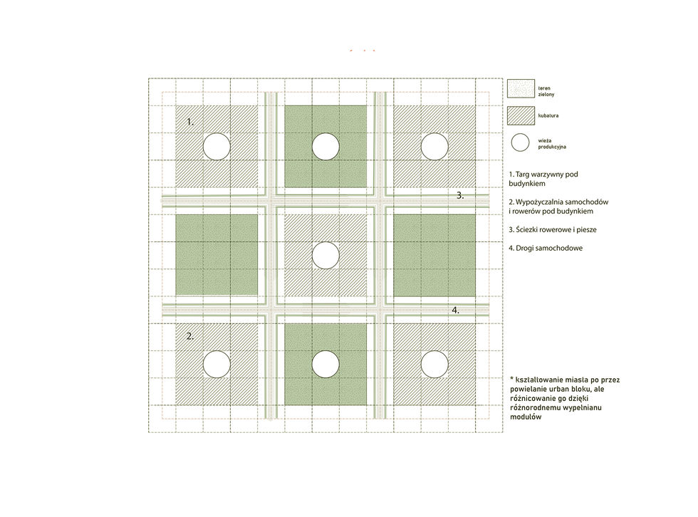 Rozważania na temat problemu projektowe przyjęto od zbadania wybranych aspektów oraz prognozowanych zmian w ich obszarze w przyszłosci. Podstawową daną była liczba populacja, która miałaby zamieszkać w projekowanym mieści. Na jej podstawie obliczoną zapotrzebowanie na żywność. Założono, że żywność będzie produkowana w farmie wertykalnej, będacej trzonem urban bloku. Urban block będzie modułowy i będzie możliwość dowolnego rozbudowywania go o kolejne moduły. 9 urban bloków będzie tworzyć samowystarczalny kwartał miejski.